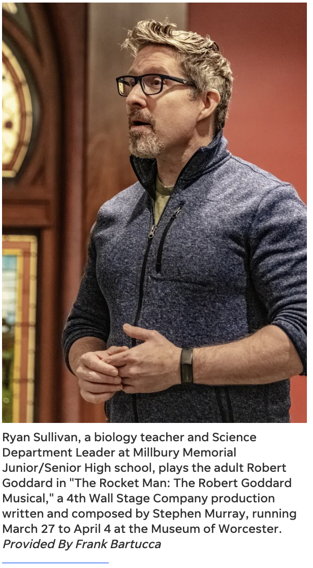 Originally from Ithaca, New York, Sullivan has taught at Millbury public schools for several years and appears in about one show a year locally if possible. He considers himself more of a singer (tenor) than an actor, but if there is a good story, as with "The Rocket Man," that's a bonus, he said. 4th Wall approached him about the show, and he has been given time to grow into the role. Guertin asked him to grow a moustache, to look like Goddard, he said.