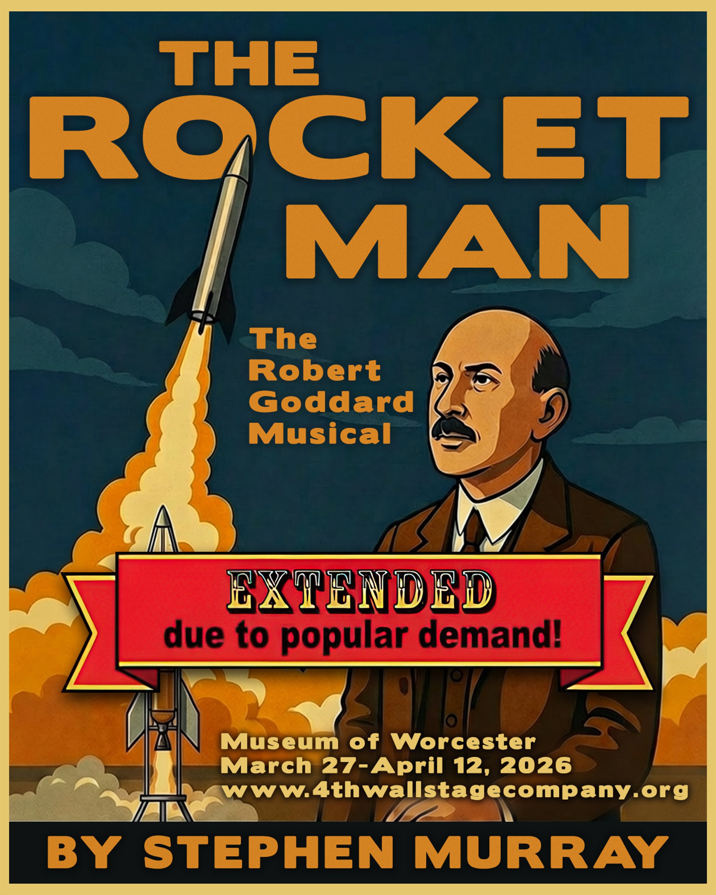 4th Wall Stage Company and Museum of Worcester present The Rocket Man, a musical based on Worcester’s own Dr. Robert Goddard – the man who invented Rocket Science – the inventor and researcher who through his teaching and relentless experimentation, created the first successful launch of a rocket in March of 1926. The musical follows his life and his love – Esther, who continued to fight for his well-deserved patents well after his passing. Worcester’s own Stephen Murray has turned their love story into a charming must be seen musical - a world premiere!